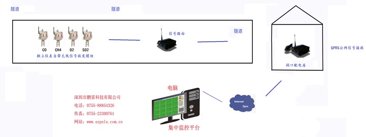 儀表本身配置的無線信號模塊,采用的數(shù)據(jù)無線傳輸距離可達3-4公里,但是隨著隧道的工況和彎道不同,可能需要配置信號中繼器。視具體隧道的長度,來配置1-2個信號中繼器,信號中繼器也采用畜電池供電。